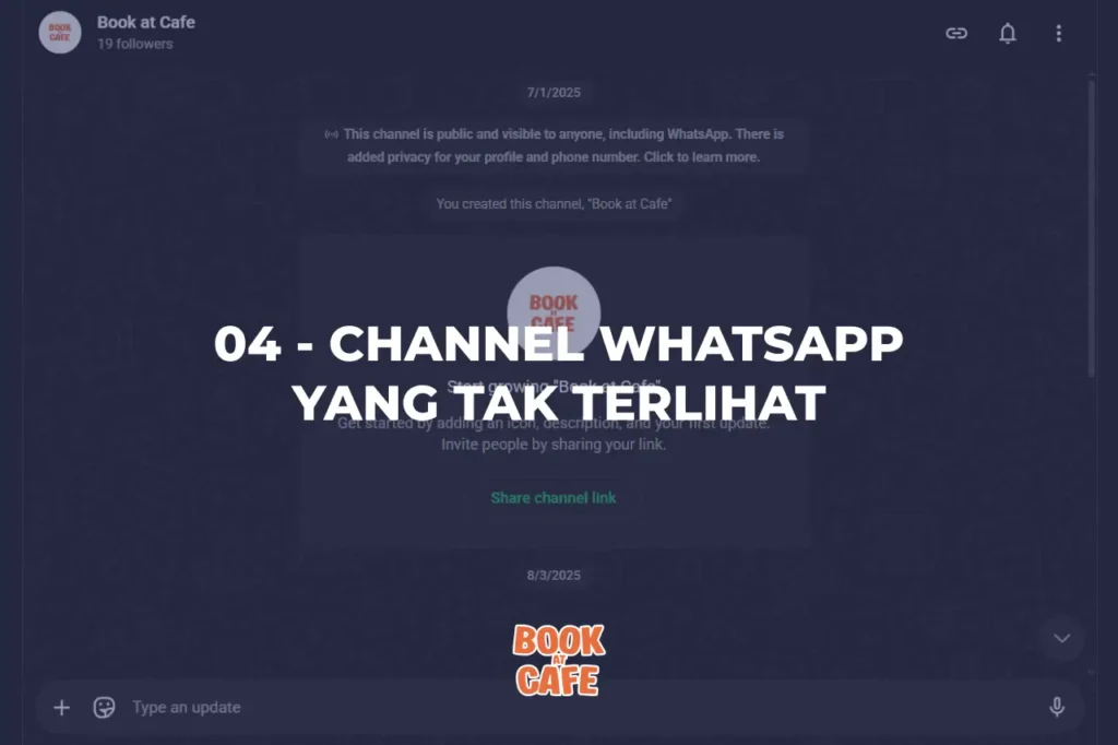 Sampai pada 30 Juni 2025, saya coba untuk mengutak atik WhatsApp dan baru menemukan tentang WhatsApp Channels. Sebuah fitur WhatsApp yang sepertinya sudah lama ada, yang letaknya ada dibawah panel Status itu. Saya mencoba mengulik tentang fitur ini dan akhirnya berencana untuk membuat channel untuk Book at Cafe. Harapannya channel ini bisa ditemukan oleh pengguna WhatsApp lainnya, seperti saya menemukan channel lainnya yang berisi ribuan followers itu. Dalam channel itu, kami membagikan jadwal Regular Meetup, foto/video pasca meetup, dan sesekali temuan-temuan dari buku.